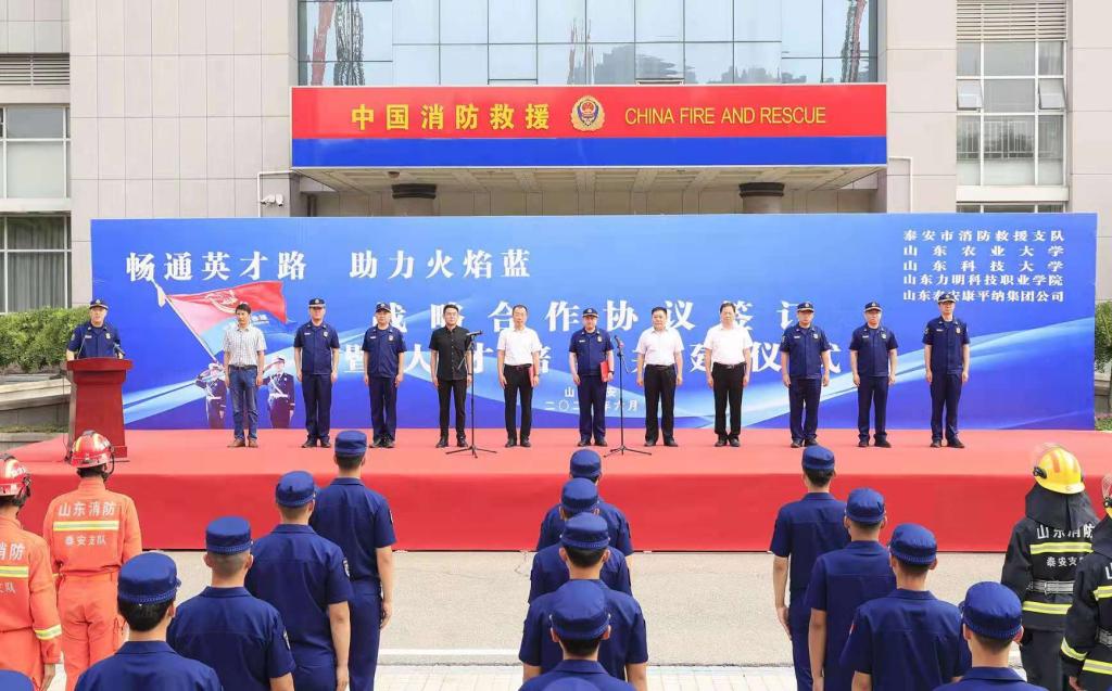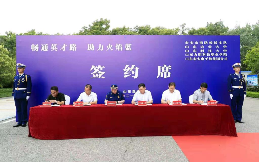为进一步深化校地校企合作,充分发挥学校的人才优势和专业优势为经济社会发展服务,6月2日,受曾庆田副校长委托,beat365官方网站直属党支部书记、院长王靖磊参加了泰安市消防救援支队、康平纳集团携手驻泰高校“畅通英才路•助力火焰蓝”战略合作协议签订暨人才培养共建仪式。